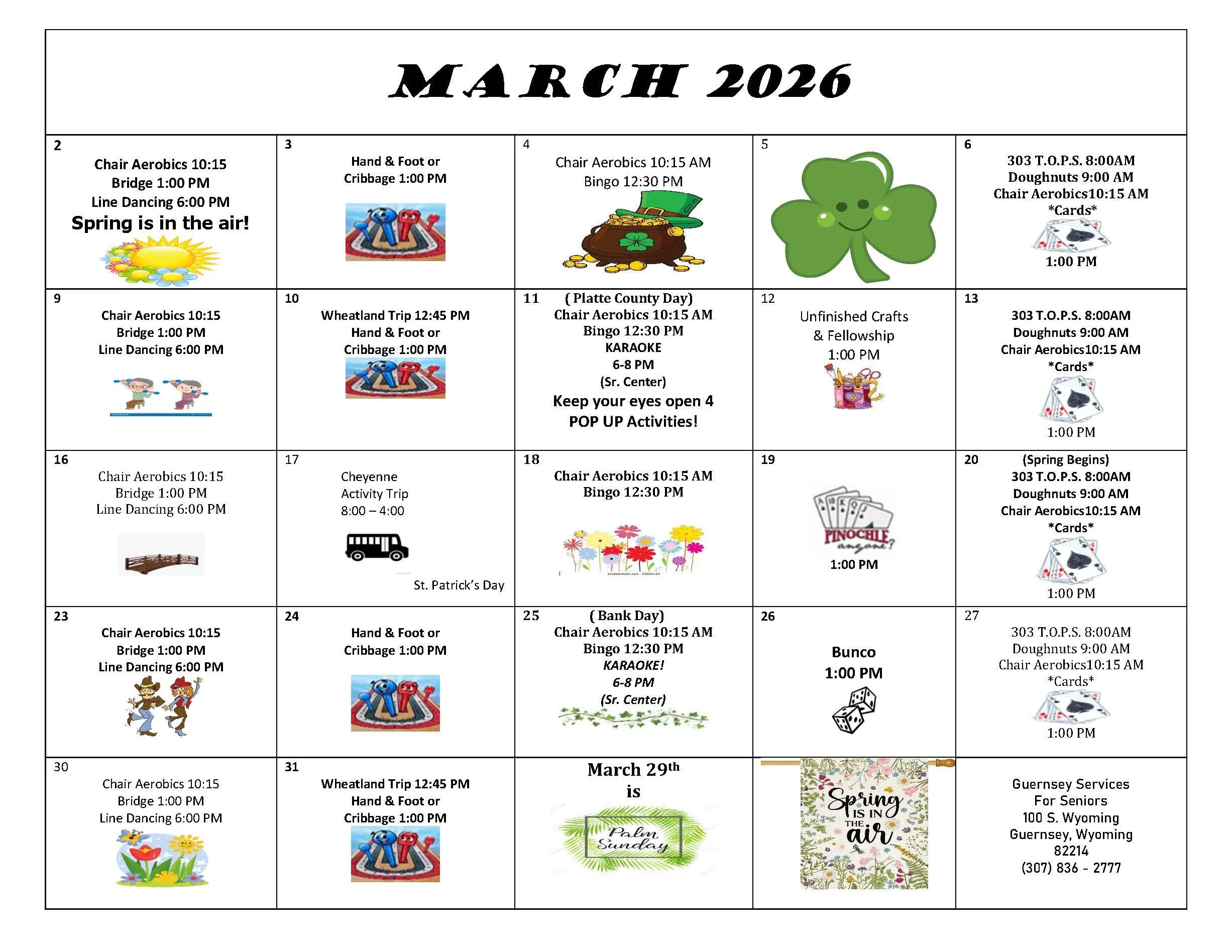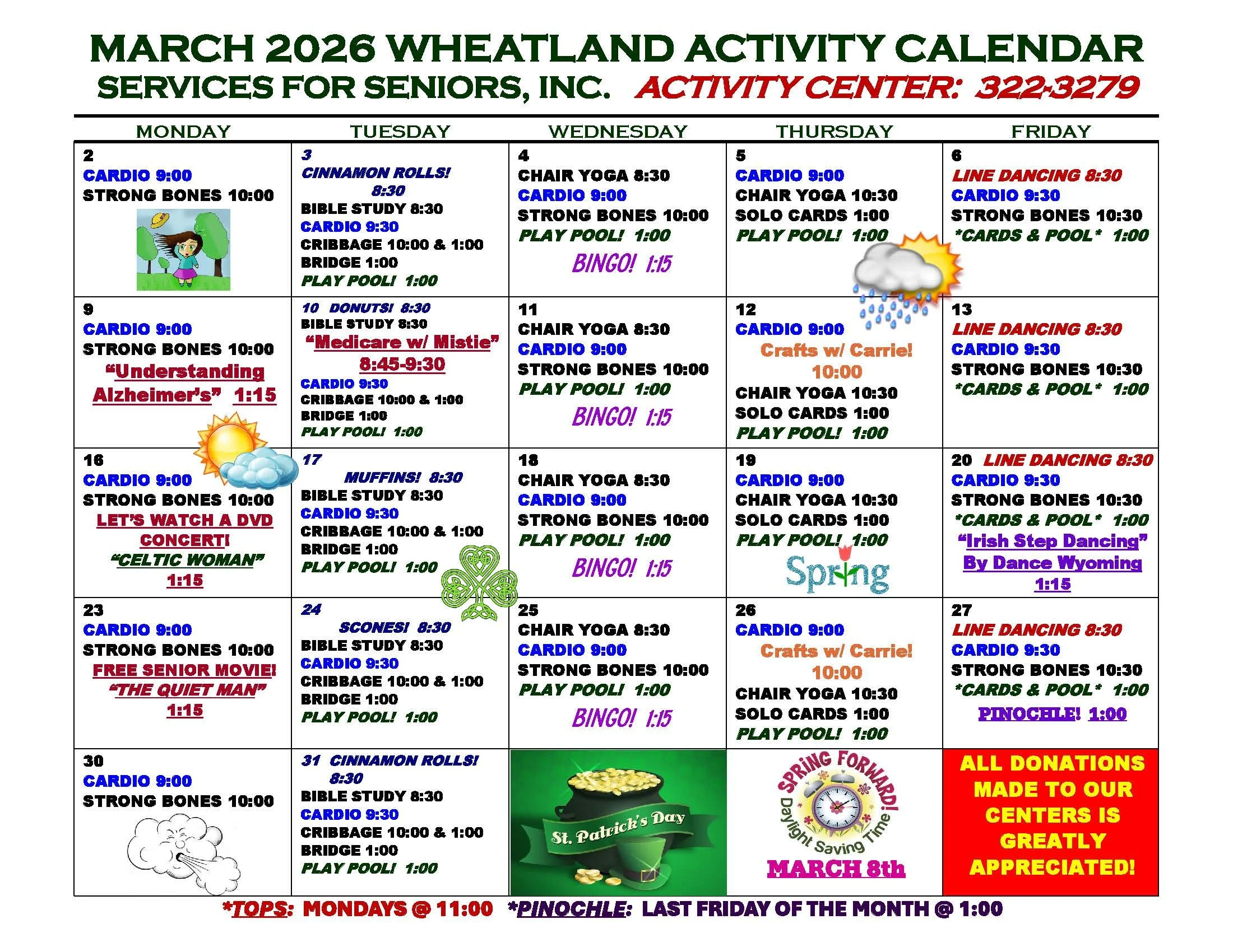 At Services for Seniors, Inc., our Wheatland and Guernsey activities are more than a calendar — it’s a community. From Cardio and Chair Yoga to Bingo, Line Dancing, crafts, movies, and special events, there’s something happening every week to keep you moving, learning, and laughing. Join us each month.